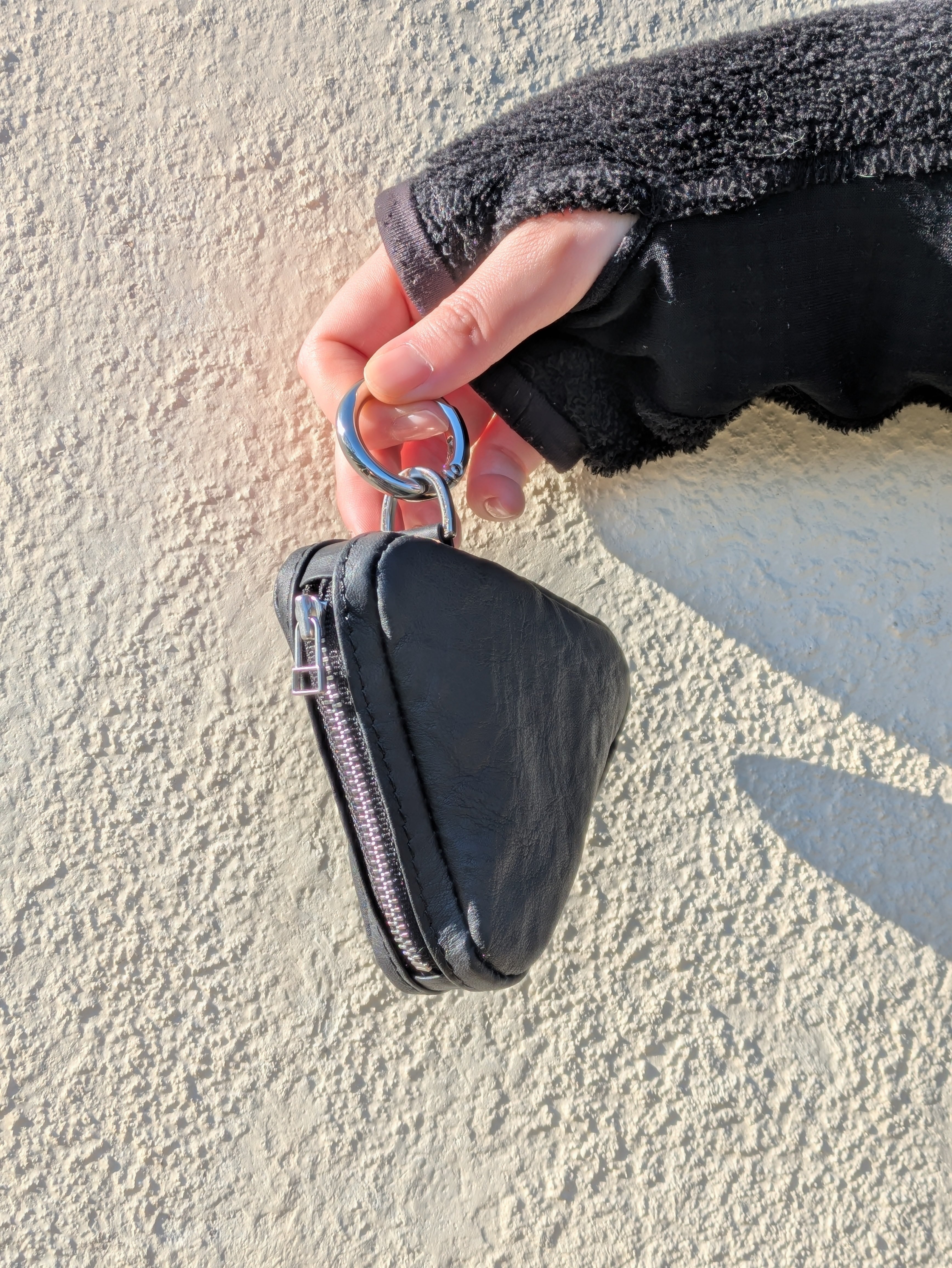 三角のフォルムがかわいいダイニーマレザーを使用したミニポーチ。